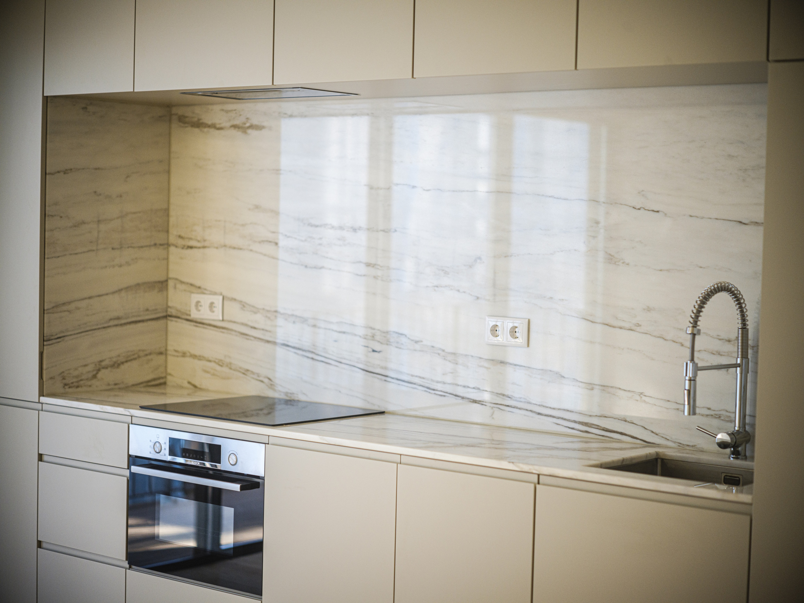 Kitchen with lacquered furniture with Quartzo Compact worktop.