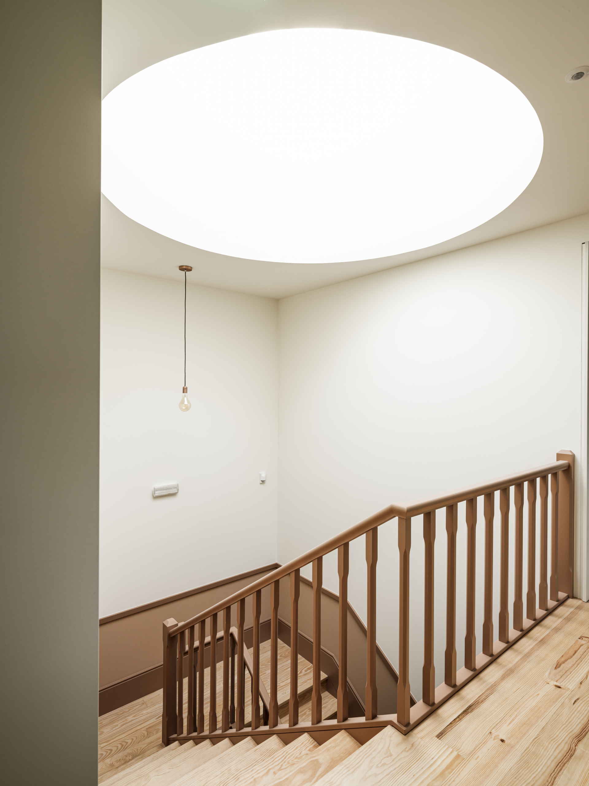 Rehabilitated building with interior staircase full of natural light, through skylight.