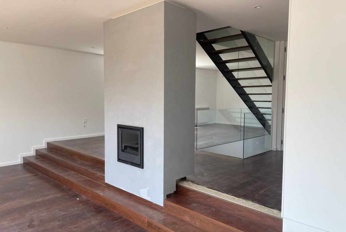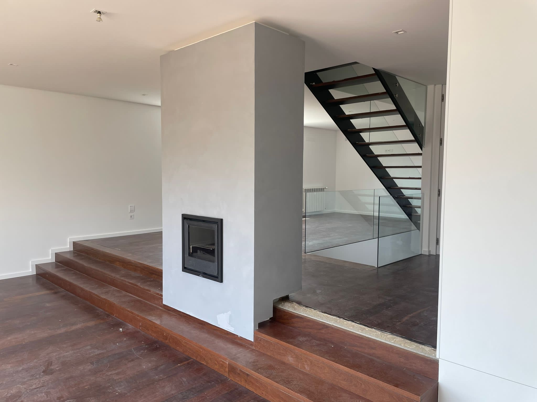 On the upper floor we highlight the large lounge with dining area and living area with fireplace and access to the outside, fully equipped kitchen and service bathroom, accessed by stairs to the upper floor.