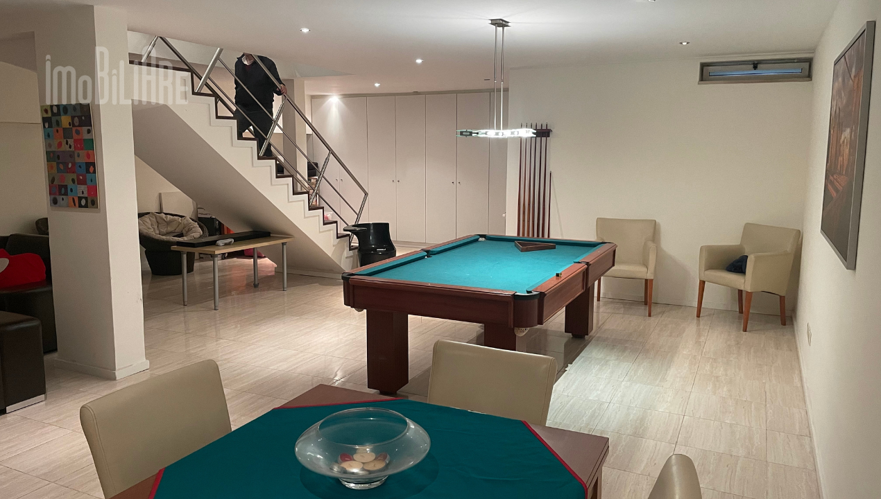 The villa has a private garden next to the main entrance, an entrance hall, a guest toilet, an equipped kitchen and a large living room, access to the outside garden through the kitchen and living room, and on the ground floor a leisure room with a pool table and personal training equipment. On the ground floor there is a private area with four bedrooms, a master bedroom suite with a terrace to the east and a full bathroom to support the other bedrooms.