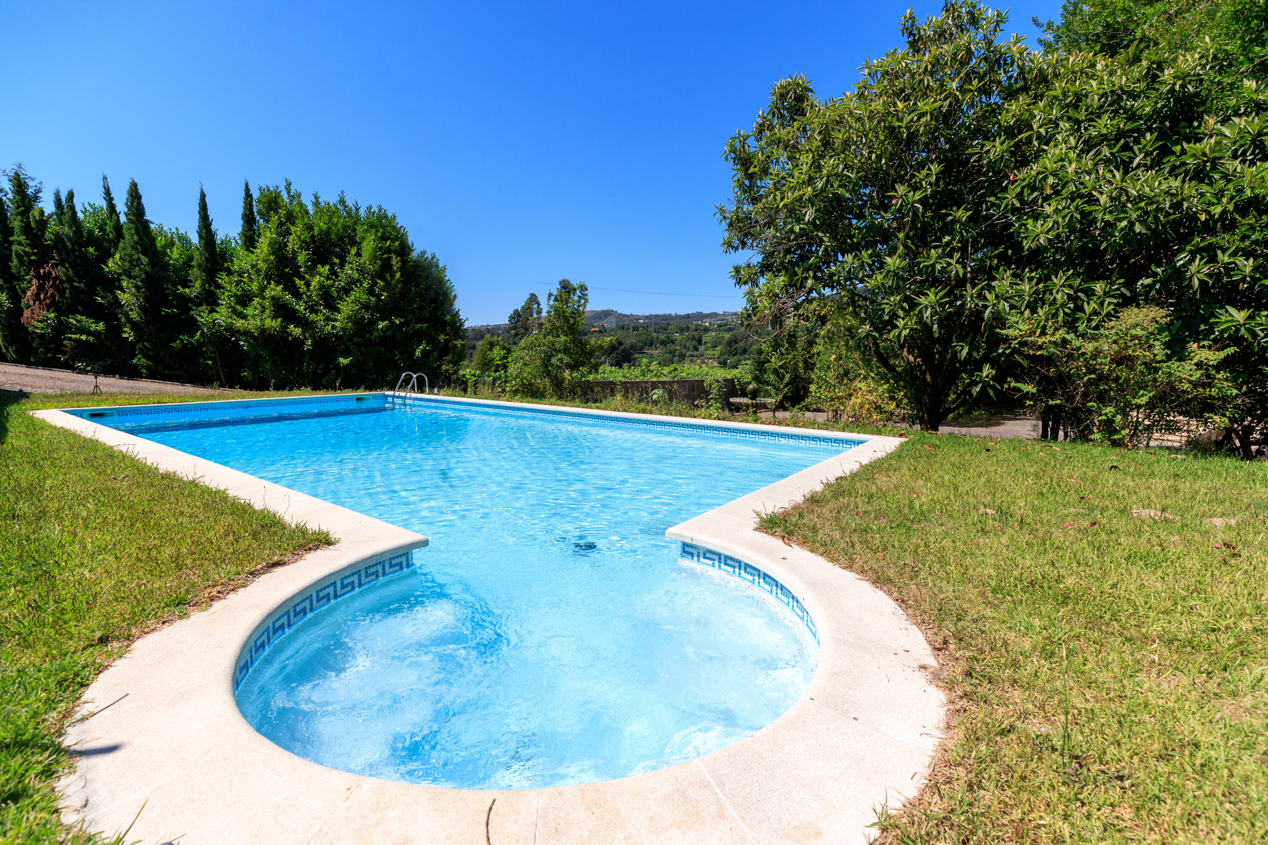 Na envolvente da moradia, , piscina com água aquecida , um court de ténis, jardim e pomar com 5000m2