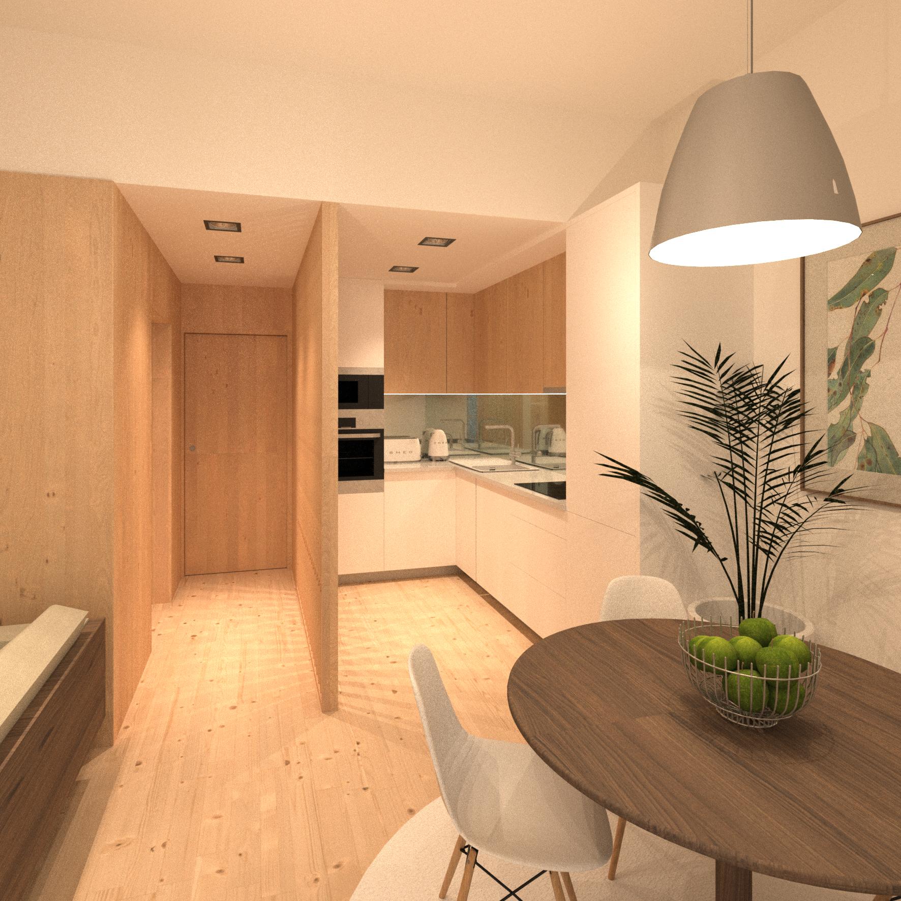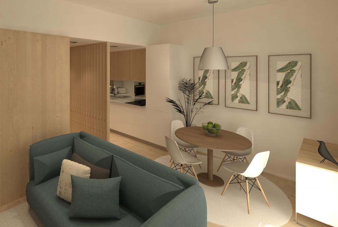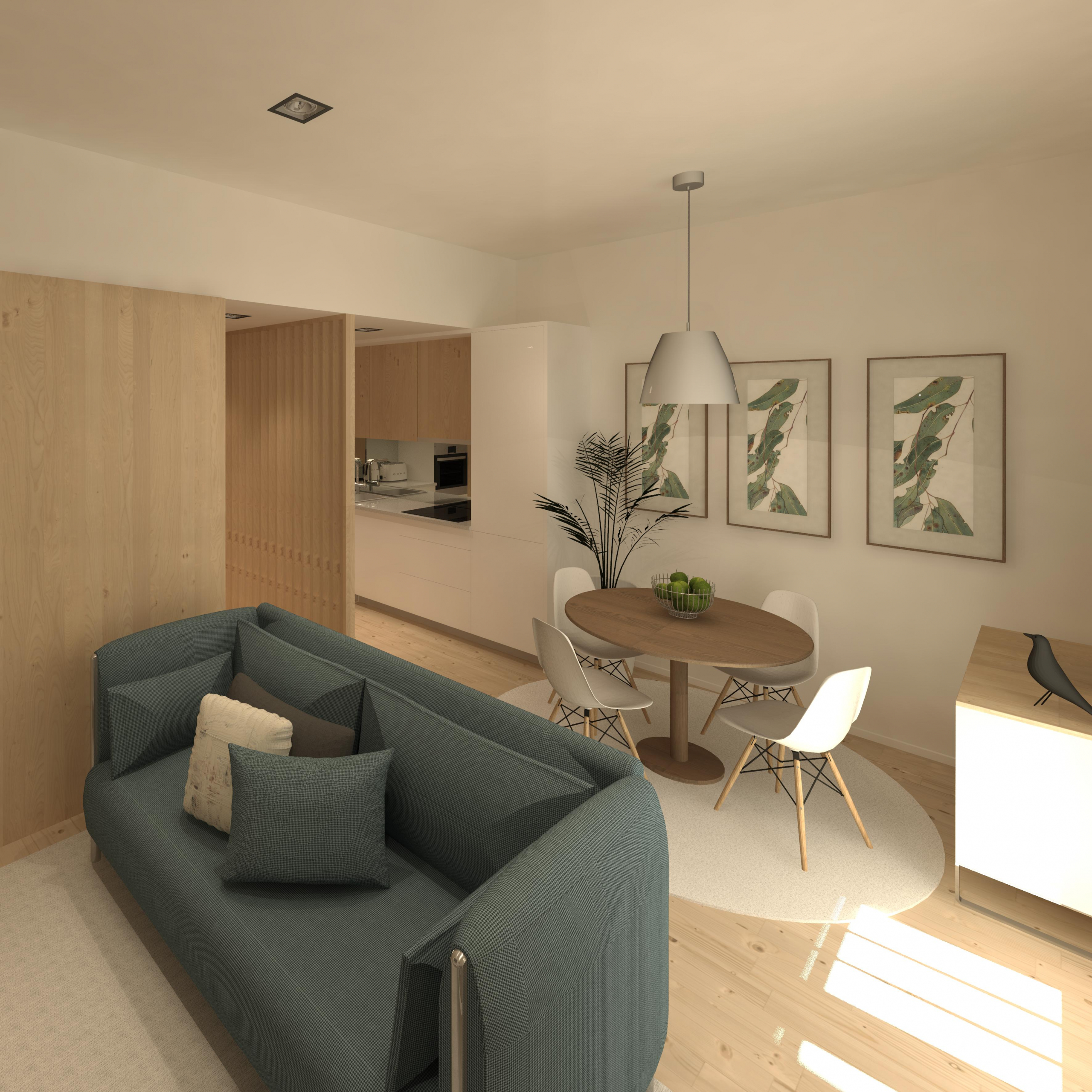 O apartamento é constituído por um hall de entrada, corredor, uma cozinha kitchenette totalmente equipada, lavandaria, sala, duas casas de banho completas, terraço nas traseiras e acesso ao jardim exterior através de escadas comuns.