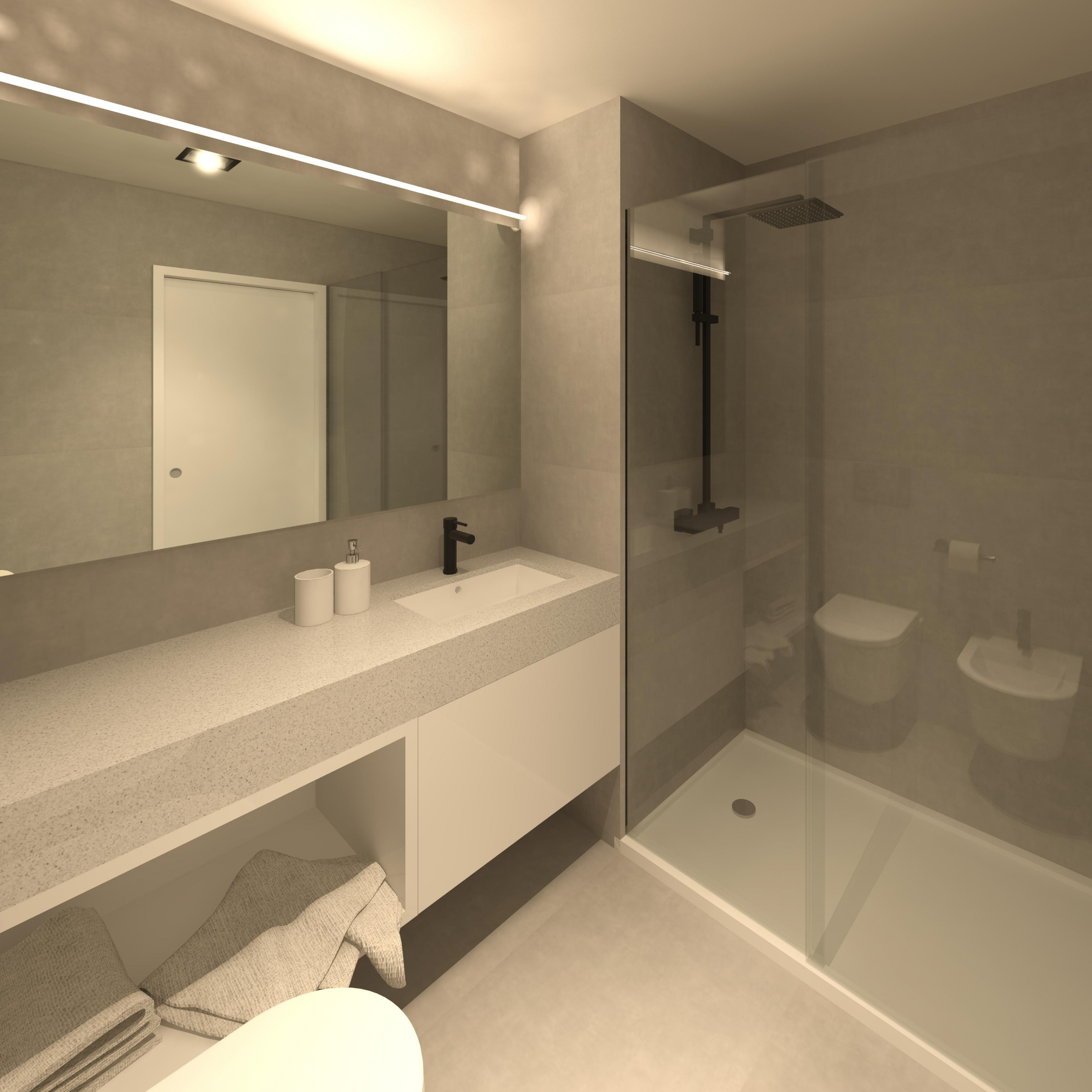 • Pavimentos e Paredes Pavimento e paredes em cerâmico rectificado 120x60cm, cor cinza betão.